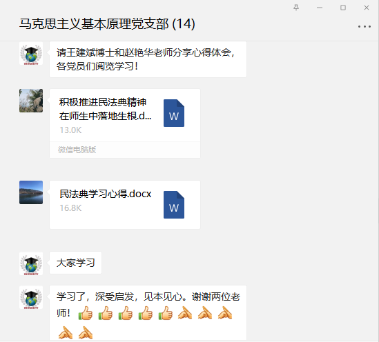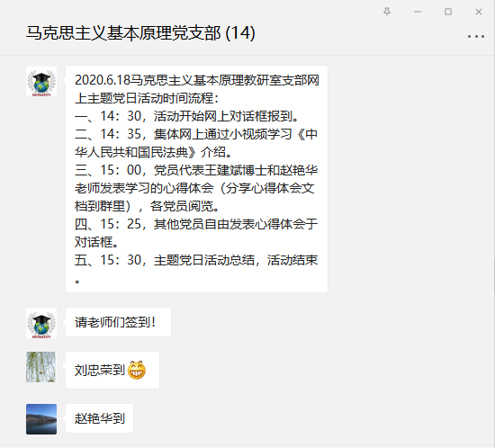 2020年6月18日下午两点半,我院马克思主义基本原理概论教研室党支部在微信支部群中开展了《中华人民共和国民法典》学习讨论主题党日活动,马克思主义基本原理概论教研室党支部全体党员参加会议。