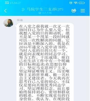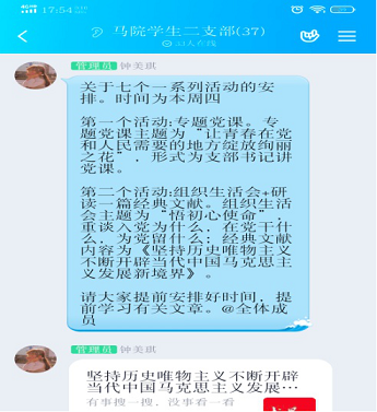 为做好毕业生党员离校前的有关工作,加强毕业生党员的教育管理,进一步提高毕业生党员党性意识和组织观念,2020年6月18日下午4:00,中共2138cn太阳集团古天乐学生二支部委员会开展线上“七个一”毕业生教育实践活动,活动分为三个部分:支部书记讲党课、党员重温“入党为什么、在党干什么、为党留什么”、经典文献阅读分享。学生二支部全体党员参加本次教育实践活动,活动由周耀玫同志主持。