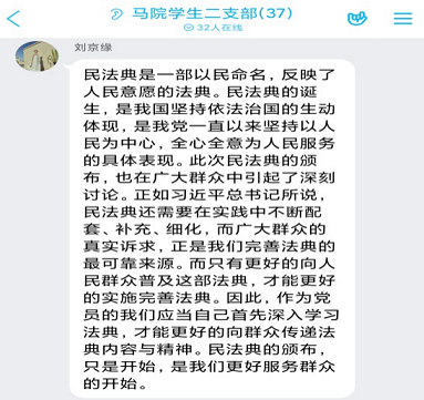 2020年6月18日下午4:00,中共2138cn太阳集团古天乐学生二支部委员会开展线上主题党日活动活动包括两项议程:一是以“悟初心使命”毕业生党员主题活动及经典文献阅读,二是学习《民法典》谈心得感悟。参加本次会议的人员有中共2138cn太阳集团古天乐学生二支部全体党员,会议由周耀玫同志主持。