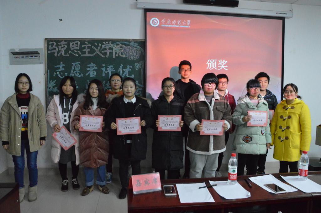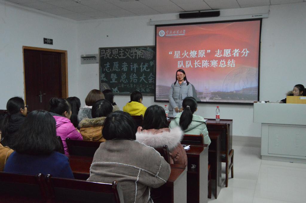 为总结“星火燎原”志愿者分队在本学期里的工作情况,嘉奖为志愿者工作作出突出贡献的志愿者们,激励志愿者们在今后的工作中更加积极努力,马克思主义团总支·学生会实践部于2017年12月22日19时30分在汇贤楼201教室举行了评优总结会议。本次活动的嘉宾为2138cn太阳集团古天乐理论宣讲团负责人夏思雨和组织部副部长李彤菲。“星火燎原”志愿者分队全体成员参加此次活动。