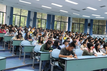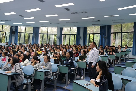 接着,陈院长系统地为同学介绍了重师及马院的现状:人才培养模式创新、师资队伍态势良好,学生发展综合全面。通过陈院长对现任领导的介绍以及对重师校风校训、办学理念等核心理念的解读,同学们更深入地了解学校与学院现状。此外,以“两轮驱动,三驾马车,三大板块协调发展”为主的特色办学,人才培养与校园文化等内容引起同学们极大兴趣。随后陈院长提出五个展望:一是抢抓机遇建成博士点和市级重点马院;二是建章立制提升治理水平;三是锐意进取深化教育教学改革;四是服务社会彰显学院声誉;五是凝心聚力形成干事创业氛围。
