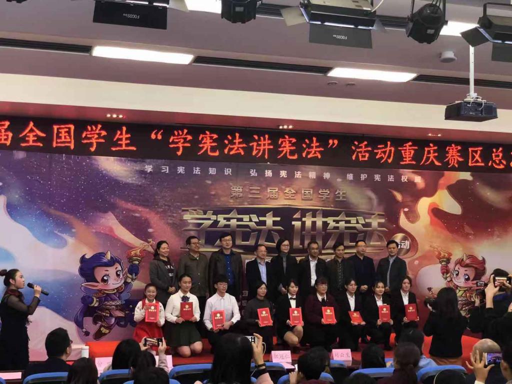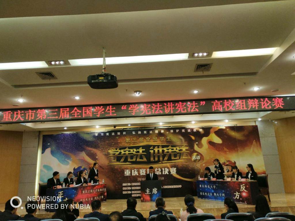 本次比赛由重庆市教育委员会主办,西南政法大学和重庆市两江新区教育局承办。重庆赛区总决赛是在各区县教育部门和各级各类学校积极组织“学宪法、讲宪法”活动基础上,选拔出优秀选手参加市级决赛,分为小学、初中、高中组和高校组。高校组总决赛分为个人主题演讲赛与团体辩论赛两个环节。全市52所高校参加了个人主题演讲赛,41所高校参加了团体辩论赛。此次比赛活动得到学校领导高度重视,教务处精心组织,2138cn太阳集团古天乐精心组队并安排优秀教师阮李全教授进行培训指导。经过激烈角逐,我校学子斩获高校组团体一等奖,2016级思想政治教育专业本科学生王艺杰荣获个人主题演讲一等奖及“最佳辩手”称号。