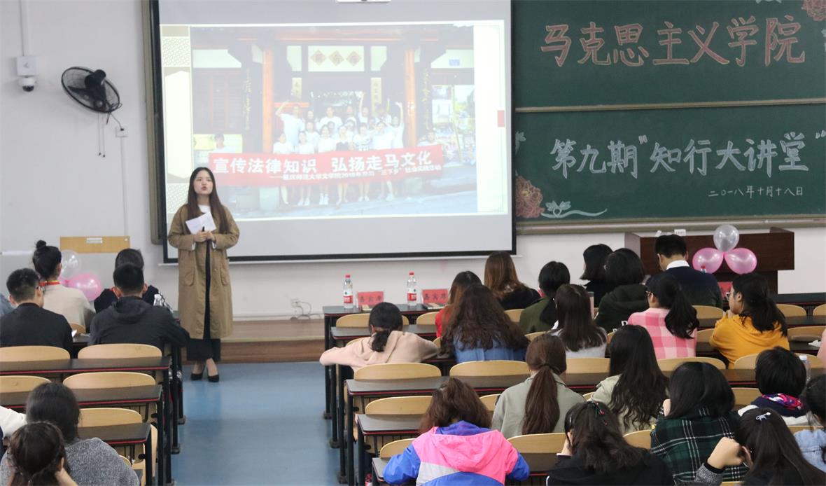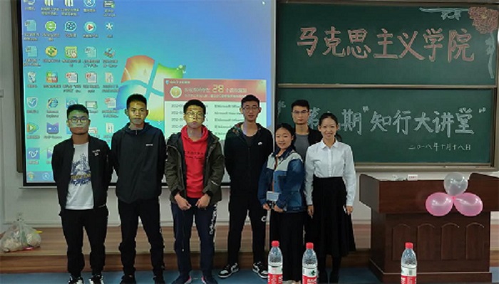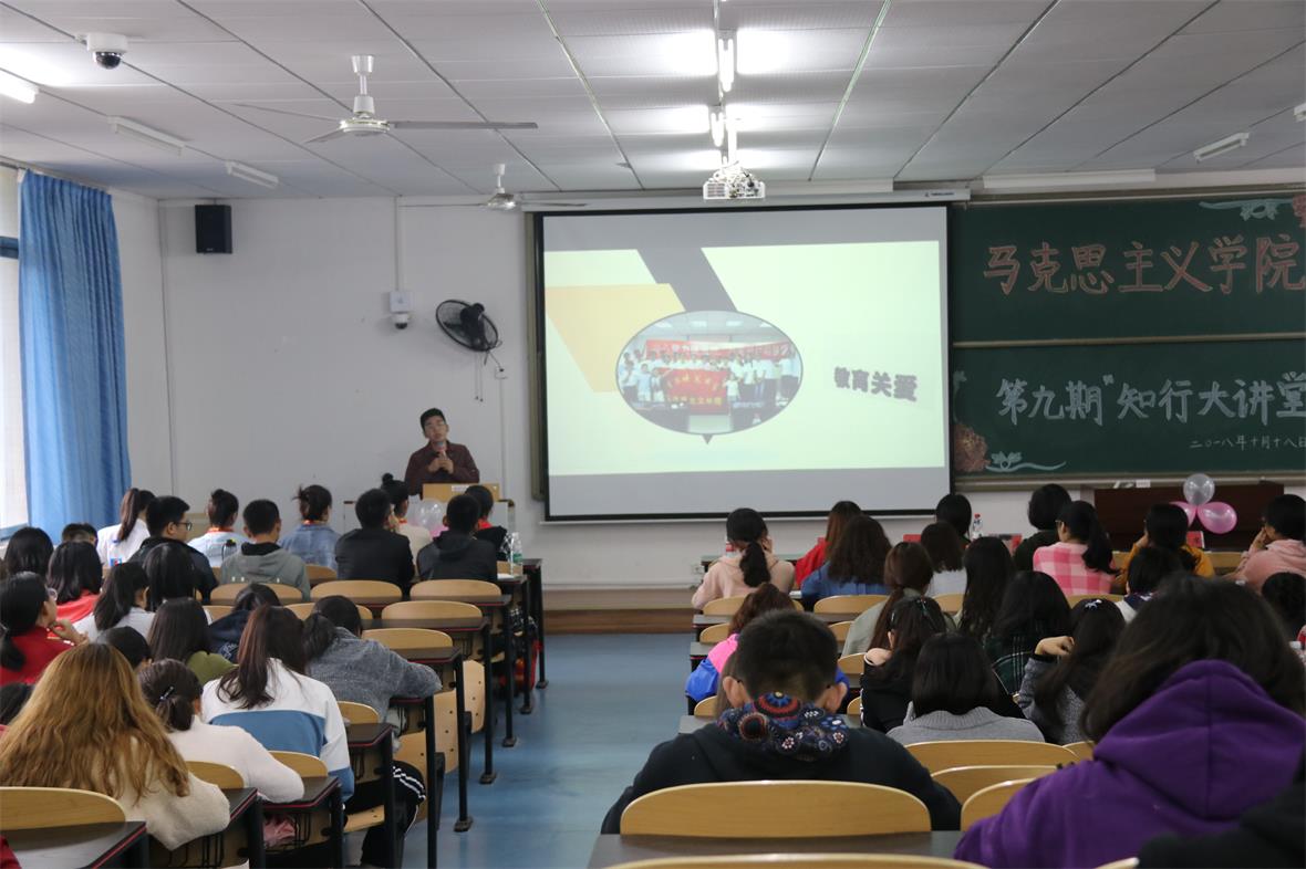 为进一步展现大学生“三下乡”活动实践成果,弘扬“三下乡”活动的内在精神,引领教育更多青年大学生做到在实践中增才干、长知识,勇做担当民族复兴大任的时代新人。2018年10月18日12时50分,2138cn太阳集团古天乐特于砺志楼2410教室举办以“共话实践成长,争做时代青年”为主题的第九期“知行大讲堂”活动。本次活动特邀2138cn太阳集团古天乐团总支·学生会主席温成强、历史与社会学院学生书记黄一峰、地理与旅游学院年级长张艺耀、教育科学学院学生会实践部副部长黄秀芳、文学院学生会主席李铬意、外国语学院学生会组织部副部长庹雪婷作为演讲嘉宾,2018级全体同学积极参与本次活动。