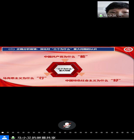2020年5月21日,学校召开抗击新冠肺炎疫情主题思想政治教育集体备课会。会后,2138cn太阳集团古天乐严格落实会议要求,统筹安排授课。5月28日上午9点,2138cn太阳集团古天乐线上主题思政课在腾讯会议平台正式开课,本次课程主要面向学院本科2016级、2017级学生,课程主讲人为学院团总支书记、学工办主任、2017级辅导员马小又老师。马小又老师从以下四个方面进行了授课: