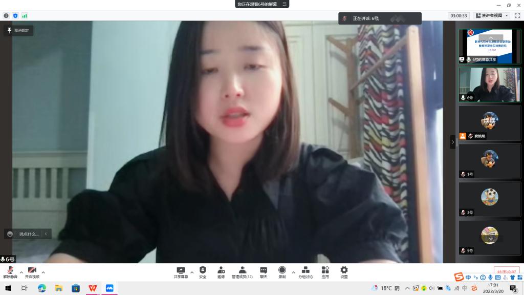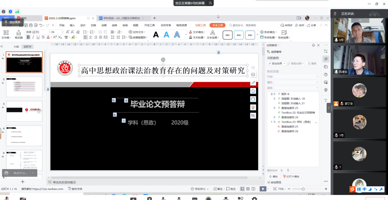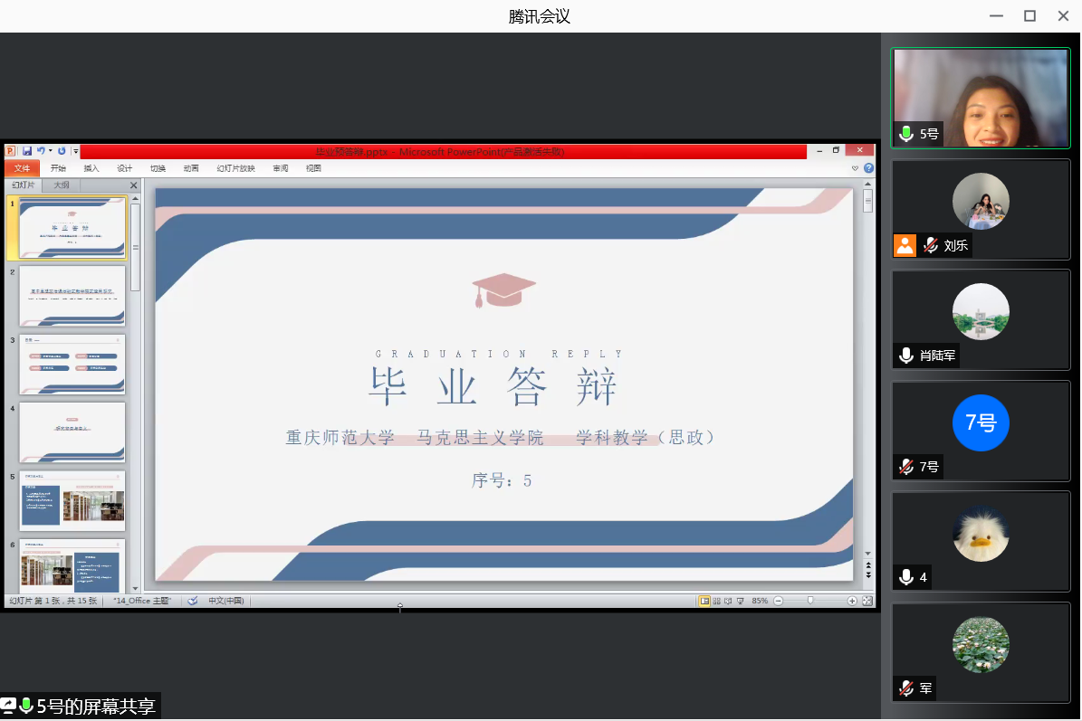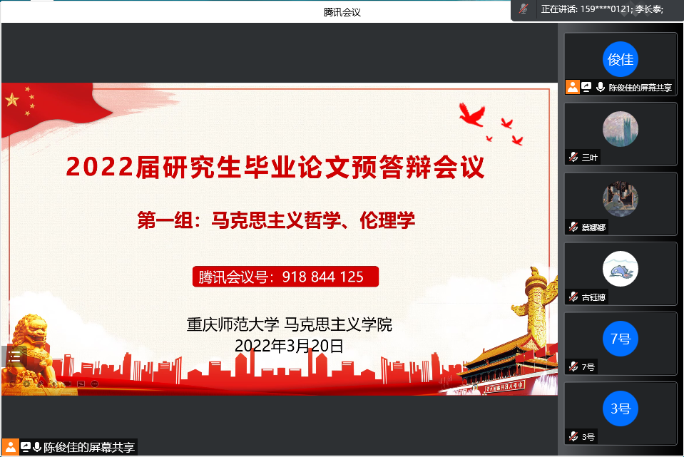 根据属地疫情防控有关要求,我校大学城校区实行封闭式管理。为加强对毕业研究生学位论文的指导和管理,切实提高研究生培养质量,学院认真贯彻落实教育部和学校工作要求,努力做到研究生学位论文与学位授予工作质量不降、标准不变、程序规范、形式便利。根据学校相关要求,2022年3月20日,我院通过腾讯会议分别开展了2022届马克思主义理论类、哲学类学术型研究生和学科教学(思政)专业学位研究生的学位论文线上预答辩工作。会议分上下午两场,共12个小组,预答辩学生总人数为79人。