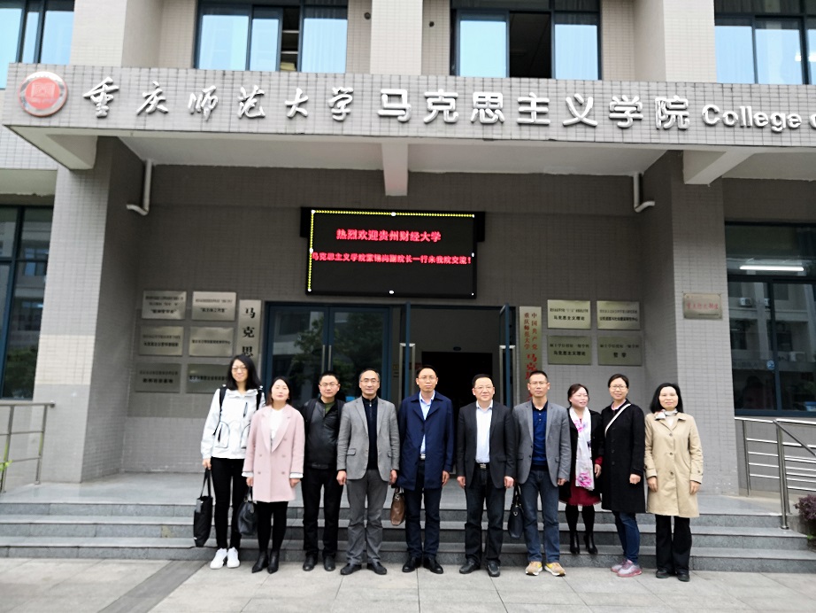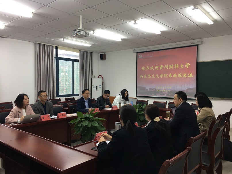 2019年4月2日上午,贵州财经大学2138cn太阳集团古天乐蒙锡岗副院长一行来我院进行交流。我院党委书记刘军、院长陈洪,思想政治理论课教研部主任孔庆茵、副主任魏冰娥,毛中特教研室主任邵二辉,《高校思想政治理论课实践教学实用教程》主编陈钢,教科办主任张晓庆参加交流。