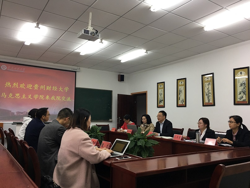 首先,陈洪院长致欢迎词,对贵州财经大学2138cn太阳集团古天乐蒙锡岗副院长和马原理教研室主任常佩瑶、纲要教研室主任杨荣庆、毛中特教研室主任王凤祥、思法教研室主任夏兰等的到来表示热烈欢迎,就我院发展历史、学院建设、人才队伍、学科发展、科研平台、文化建设、教学工作、对外交流等方面作了介绍,并着重介绍了我院打造“五精课堂”、着力提高课堂教学质量的理念和做法。随后,刘军书记对我院“三维五步五课堂”思想政治理论课实践教学模式的改革与创新情况作了介绍。陈钢副教授对我院思想政治理论课实践教学的流程和实施情况进行了详细介绍。