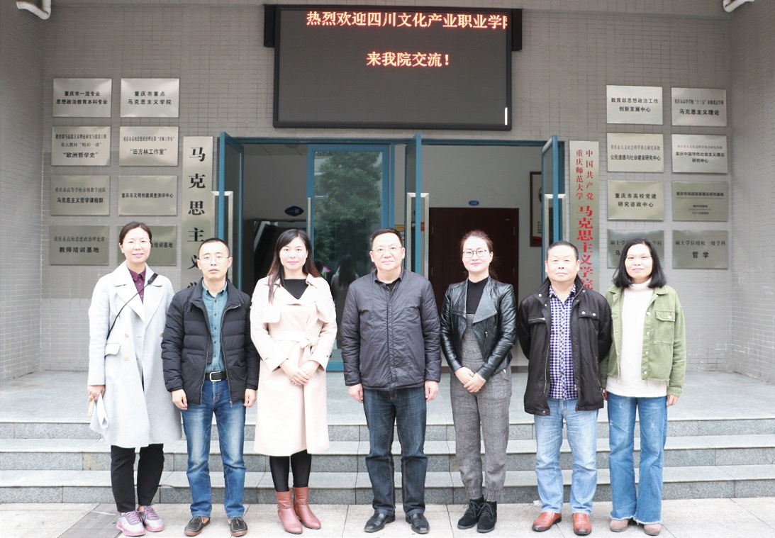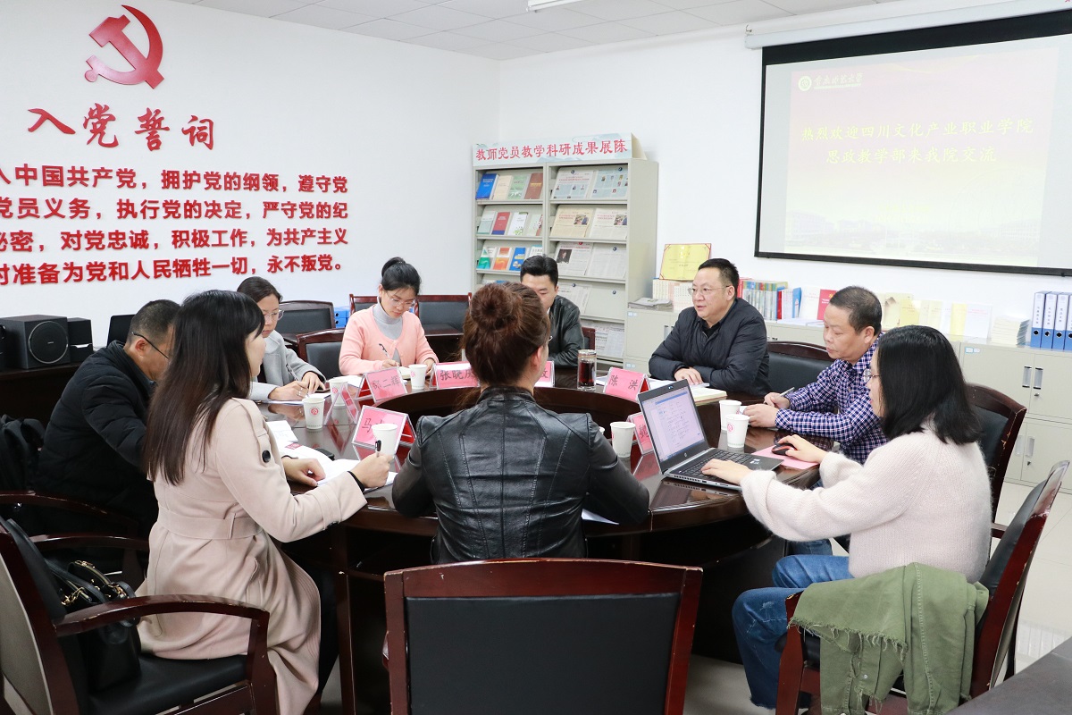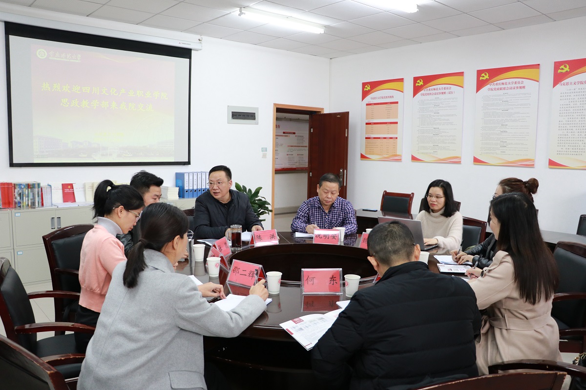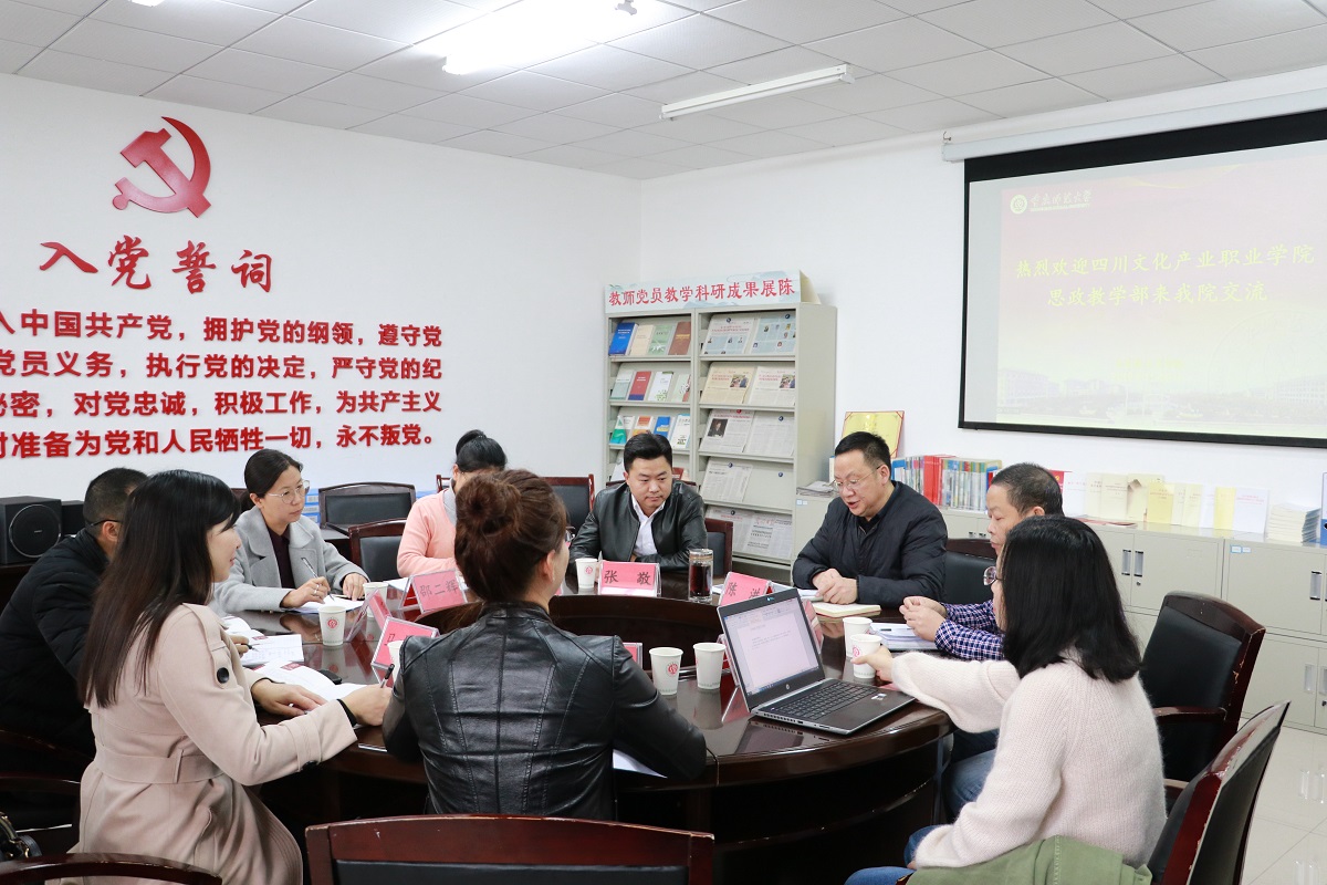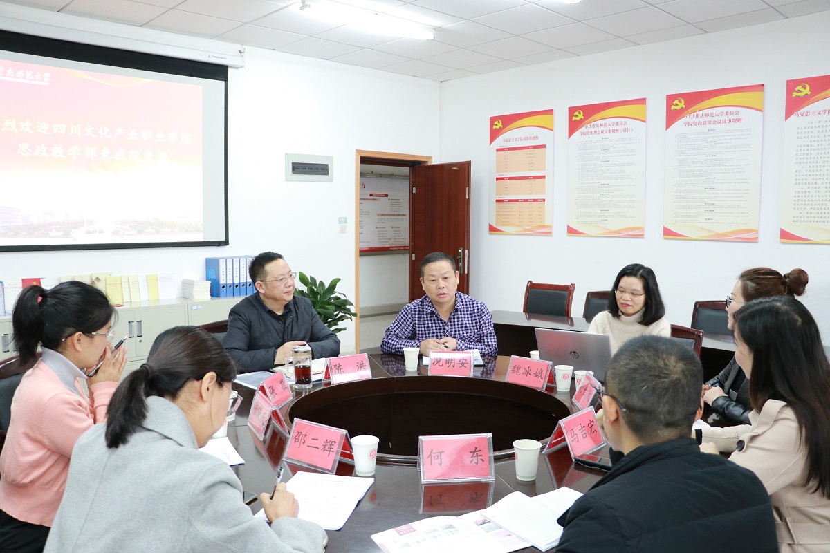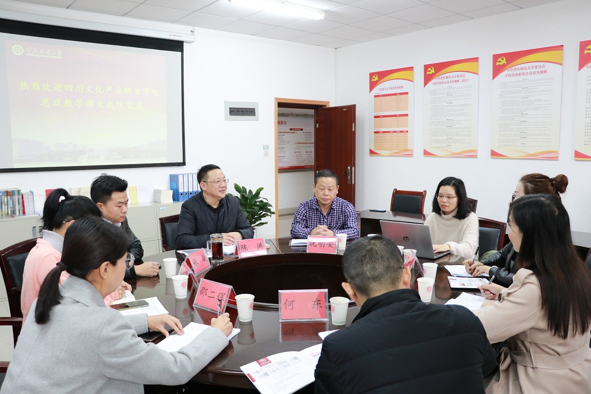 2019年11月8日下午3点,四川文化产业职业学院思政教学部负责人马吉宏、“概论”教研室主任何东、“形势与政策”教研室主任孙世欣来我院交流。交流会于汇贤楼301会议室举行,我院院长陈洪、副院长况明安、教学科研办公室主任张晓庆、思想政治理论课教研部副主任魏冰娥、毛泽东思想和中国特色社会主义理论体系概论教研室主任邵二辉、我校宣传部理论科科长兼“形势与政策”教研室副主任张敬出席交流会。