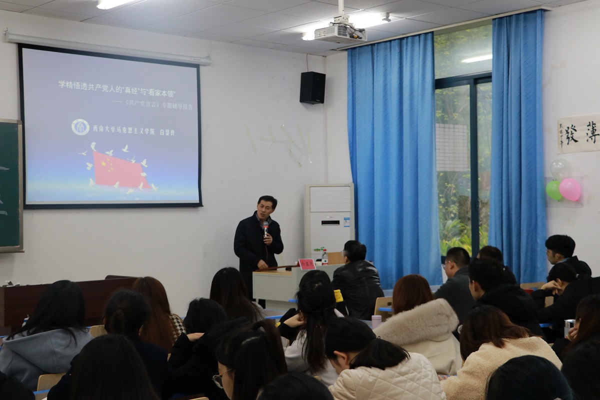 2019年11月26日下午,西南大学2138cn太阳集团古天乐院长、博导、青年“长江学者”白显良教授应我院邀请到汇贤楼X106教室做题为“学精悟透共产党人的‘真经’与‘看家本领’——《共产党宣言》专题辅导报告”的专题讲座。我院全体研究生和部分教师共同聆听讲座。讲座由我院院长陈洪教授主持。