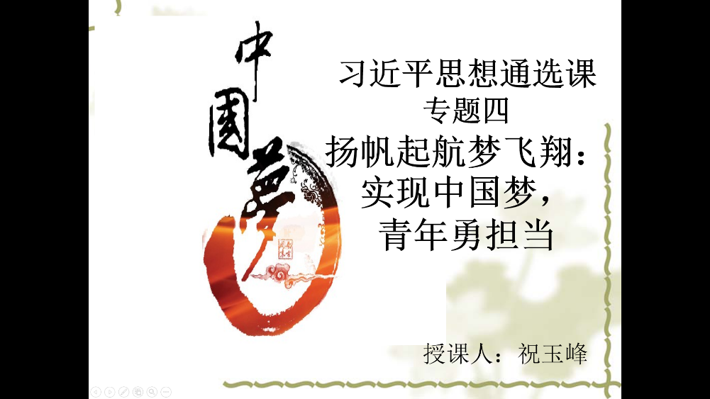 为深入学习习近平新时代中国特色社会主义思想,引导当代大学生明确中国梦的内涵,使同学们更加明确肩负的责任与使命。2020年4月8日晚,我校开展的全校通选课《习近平新时代中国特色社会主义思想》第四期第四讲由2138cn太阳集团古天乐祝玉峰教授主讲,讲课主题为“扬帆起航梦飞翔:实现中国梦,青年勇担当”。本次授课采用了QQ群课堂直播的线上教学形式,选课同学按时、全部参与了此次线上教学活动。