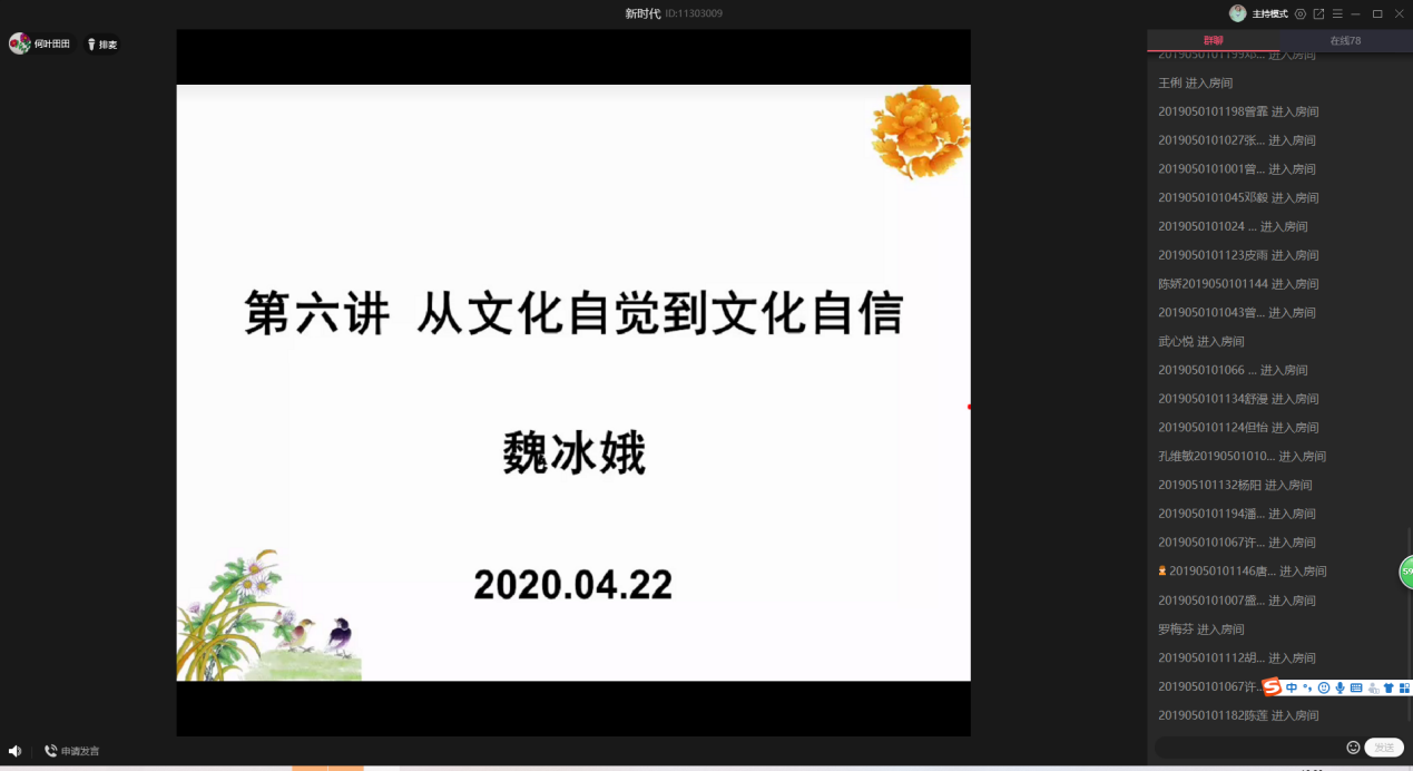 为深入学习习近平新时代中国特色社会主义思想,培养学生的文化自觉,增强文化自信。2020年4月22日晚,我校开展的全校通选课《习近平新时代中国特色社会主义思想》第四期第六讲由2138cn太阳集团古天乐魏冰娥教授主讲,讲课主题为“从文化自觉到文化自信”。本次授课采用了QQ群课堂直播的线上教学形式,选课同学按时、全部参与了此次线上教学活动。