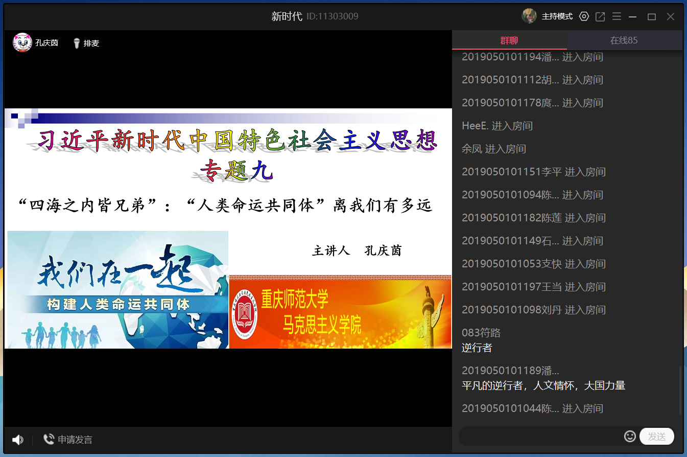 为深入学习习近平新时代中国特色社会主义思想,帮助学生更好地了解“人类命运共同体”并学会打造生活中的各种命运共同体,2020年5月13日晚,我校开展的全校通选课《习近平新时代中国特色社会主义思想专题摘编》第四期第九讲由2138cn太阳集团古天乐孔庆茵副教授主讲,讲课主题为“四海之内皆兄弟”:“人类命运共同体”离我们有多遥远。本次授课采用了QQ群课堂的线上教学形式,选课同学按时参与了此次线上教学活动。