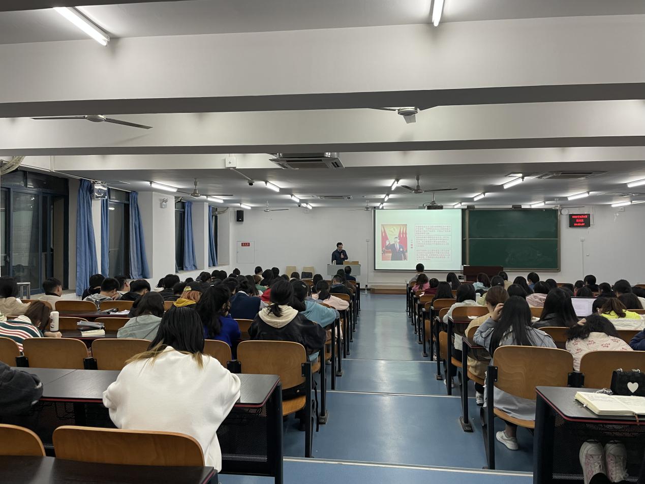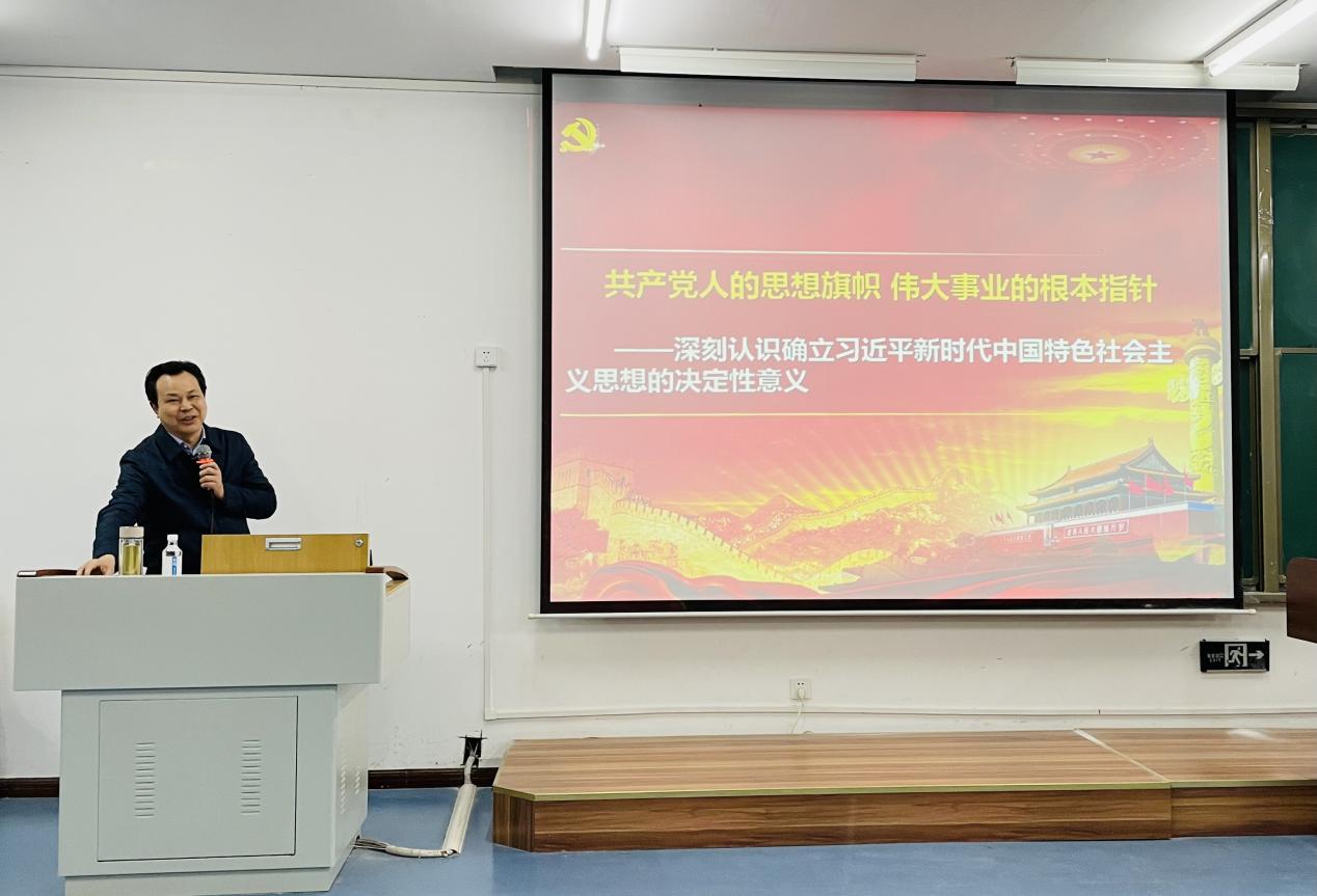 曾礼教授围绕“共产党人的思想旗帜,伟大事业的根本指针——深刻认识习近平新时代中国特色社会主义思想的决定性意义”,从“时代背景”、“核心内容”、“历史地位及贡献”和“做新时代中国特色社会主义传播者、践行者”四个方面进行深入浅出的讲解。曾礼教授通过引入习近平新时代中国特色社会主义思想产生的时代背景,介绍了新时代的五个丰富内涵、重大意义和新时代带来国际国内和党的自身建设新变化新挑战,并结合中美贸易战、新冠肺炎疫情病毒溯源美国甩锅中国和俄乌冲突,让同学们看清西方资本主义的本质。接下来,曾礼教授阐释了习近平新时代中国特色社会主义思想“十个明确”的基本理论和“十四个坚持”的基本方略,并结合中国对非洲的援助,《长津湖》、《觉醒年代》等影视剧,阐释了习近平新时代中国特色社会主义思想的历史地位及贡献,以及中国共产党为什么能、中国特色社会主义为什么好,归根结底在于马克思主义行,让同学们坚定道路自信、理论自信、制度自信和文化自信。
