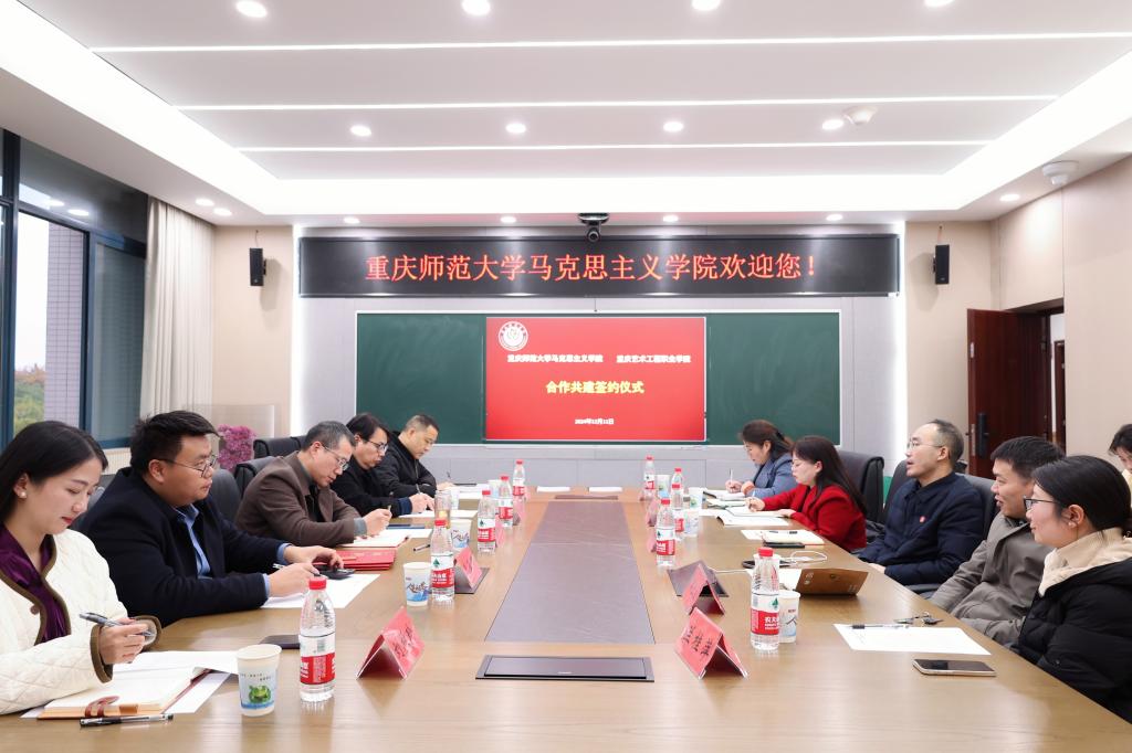 2024年12月11日,我校与重庆艺术工程职业学院举行合作共建签约仪式。双方经友好协商决定,为深入学习贯彻习近平总书记关于思政课建设的重要指示精神和关于教育的重要讲话精神,贯彻落实全国和重庆市教育大会、全国和重庆市新时代学校思政课建设推进会的重要精神,全面贯彻党的教育方针,落实立德树人根本任务,打造新时代西部思政教育新高地,推进《重庆市推进新时代学校思政课建设行动方案(2024-2027)》,构建大中小学思政教育一体化建设格局,落实公办民办院校“手拉手”、本科专科院校“结对行”等工作机制,双方在马克思主义理论教育、思想政治教育的专业师资培养,课程建设,课题研究,理论研究成果的传播宣传、教育实践和辐射推广等方面开展合作。