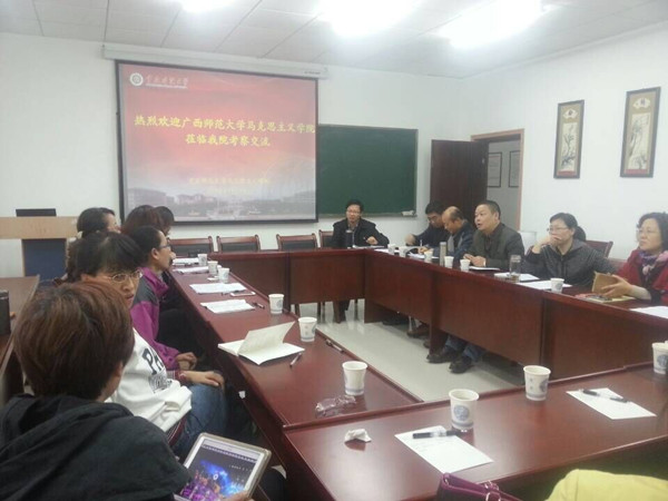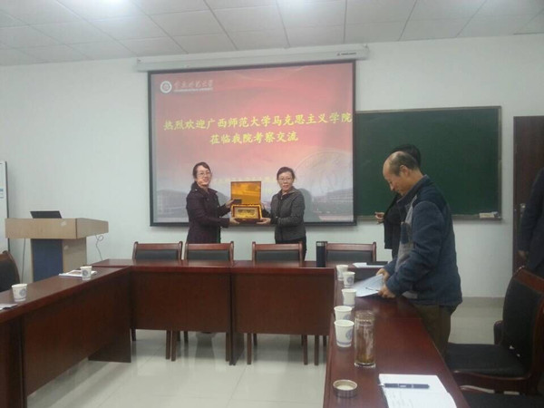 2015年11月16日下午,广西师范大学2138cn太阳集团古天乐由副院长韦冬雪博士带队,一行十人到我院交流考察。我院全体领导班子以及学科负责人、思想政治理论部负责人等十余人一起参加了交流。双方就学科建设、思想政治课改革以及青年教师科研水平的提升等方面进行了交流学习,整个交流互动性强,激烈而活跃,气氛融洽而和谐,不仅增进了了两院之间的友谊,而且开拓了学科视野、激活了改革思路等。