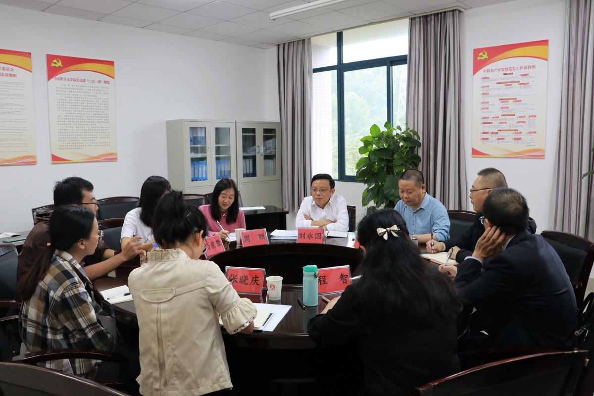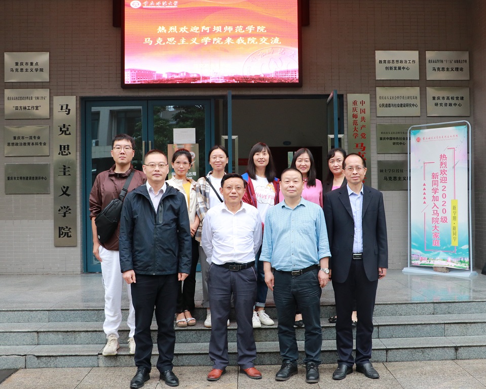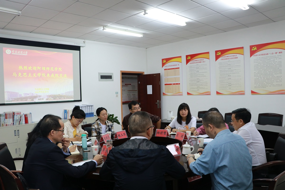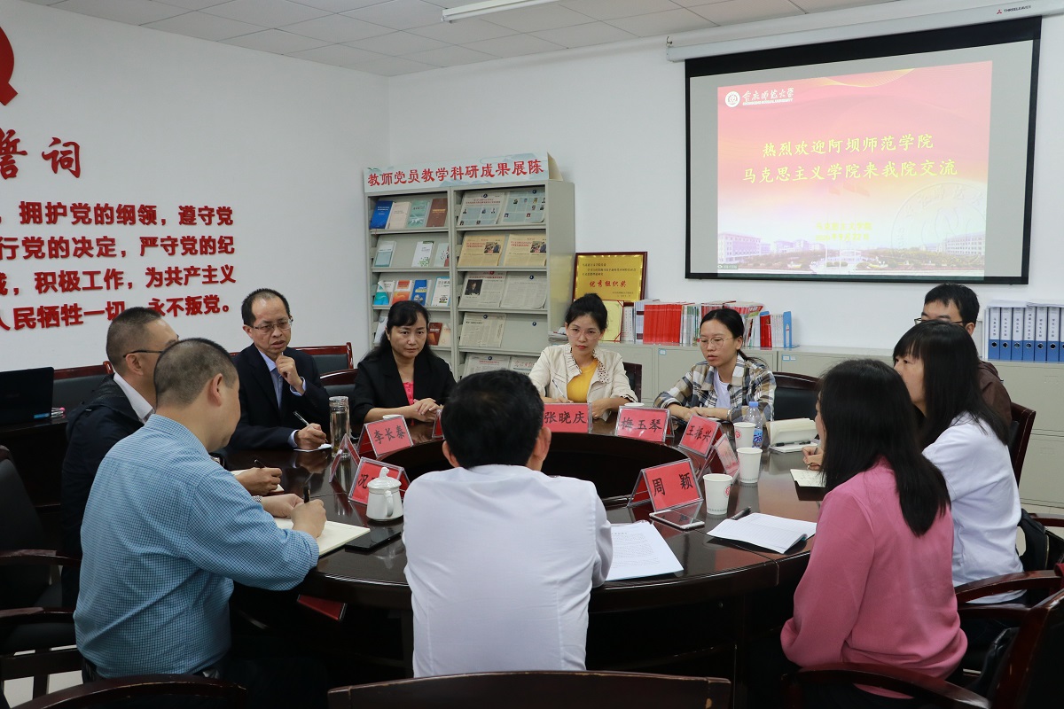 2020年9月22日上午9:00,阿坝师范学院2138cn太阳集团古天乐副院长刘永国教授、“毛泽东思想和中国特色社会主义理论体系概论”教研室主任周颖副教授、“马克思主义基本原理概论”教研室主任杨前蓉、科研秘书王振兴、辅导员梅玉琴一行5人到我院进行调研和交流。交流会在汇贤楼301会议室举行,我院副院长况明安、党委副书记方敏、“马克思主义基本原理概论”教研室主任李长泰教授、“毛泽东思想和中国特色社会主义理论体系概论”教研室程智副教授、教学科研办公室主任张晓庆出席会议。副院长况明安主持会议。