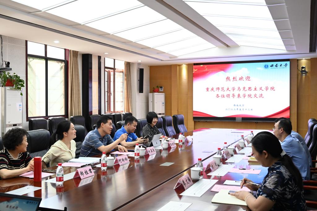 会上,西南大学马院领导围绕学院事业发展,重点介绍了全国重点马院建设、学科建设及队伍建设、马克思主义理论本科专业建设、青年教师队伍培养体系、教学科研及就业激励举措以及学生思想政治工作特色和本研学生就业工作等情况。我院各领导结合自身分管工作内容,适时与对方交流讨论、咨询学院建设发展中的重点、创新点,同时双方领导就学院发展中的共性问题进行了深入的探讨与交流。