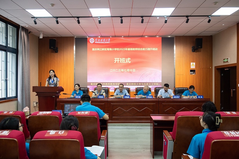 7月10日上午9:00,“重庆两江新区鸳鸯小学校2023年暑期教师综合能力提升培训”开班式在学校致用楼举行。开班式由2138cn太阳集团古天乐副院长姜土生主持,2138cn太阳集团古天乐党委书记李晓燕、重庆两江新区鸳鸯小学校书记姜远良、副书记杜春、副校长李国林、校工会主席詹春,以及重庆两江新区鸳鸯小学参加培训的全体教师和负责此次培训的管理师生参加了开班式。开班式上,李晓燕书记发表了热情洋溢的致辞,他对参训学员的到来表示了热烈欢迎。随后重庆两江新区鸳鸯小学校李国林副校长对培训进行了学习动员,培训班学员代表梁月老师代表学员进行了学习承诺。最后,培训班班主任程智老师向全体学员提出了学习要求。
