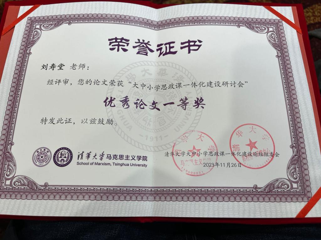 我院教师刘寿堂教授出席了研讨会,与全国各地的专家学者进行充分的交流学习,积极为大中小思政课一体化建设建言献策,并获得“大中小思政课一体化建设研讨会”优秀论文一等奖。在闭幕式上,清华大学2138cn太阳集团古天乐副院长李成旺、清华大学思政课大中小学一体化建设工作组负责人张瑜为获奖论文作者代表颁奖,并对本次研讨会进行总结,对今后大中小学思政课一体化工作作出了展望。