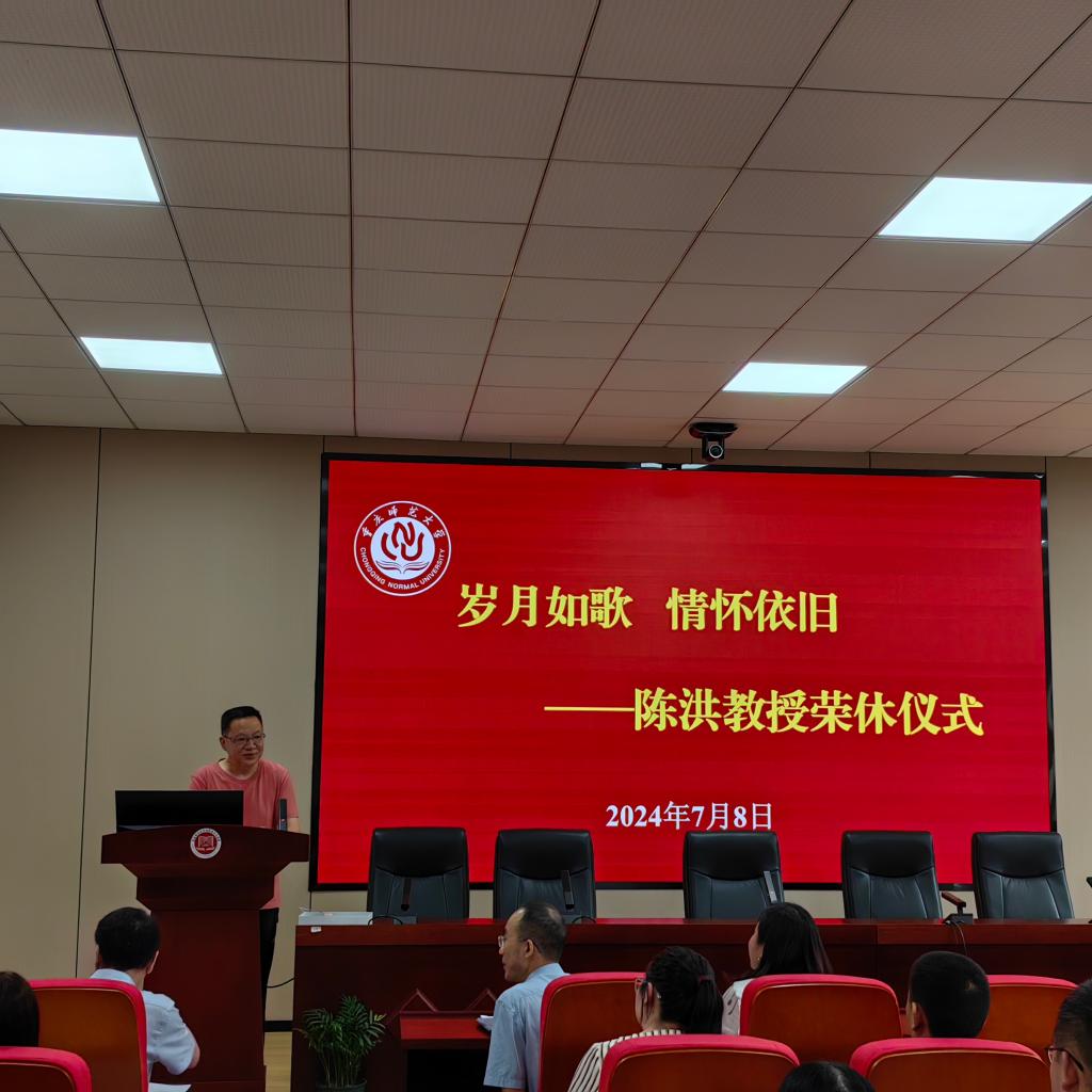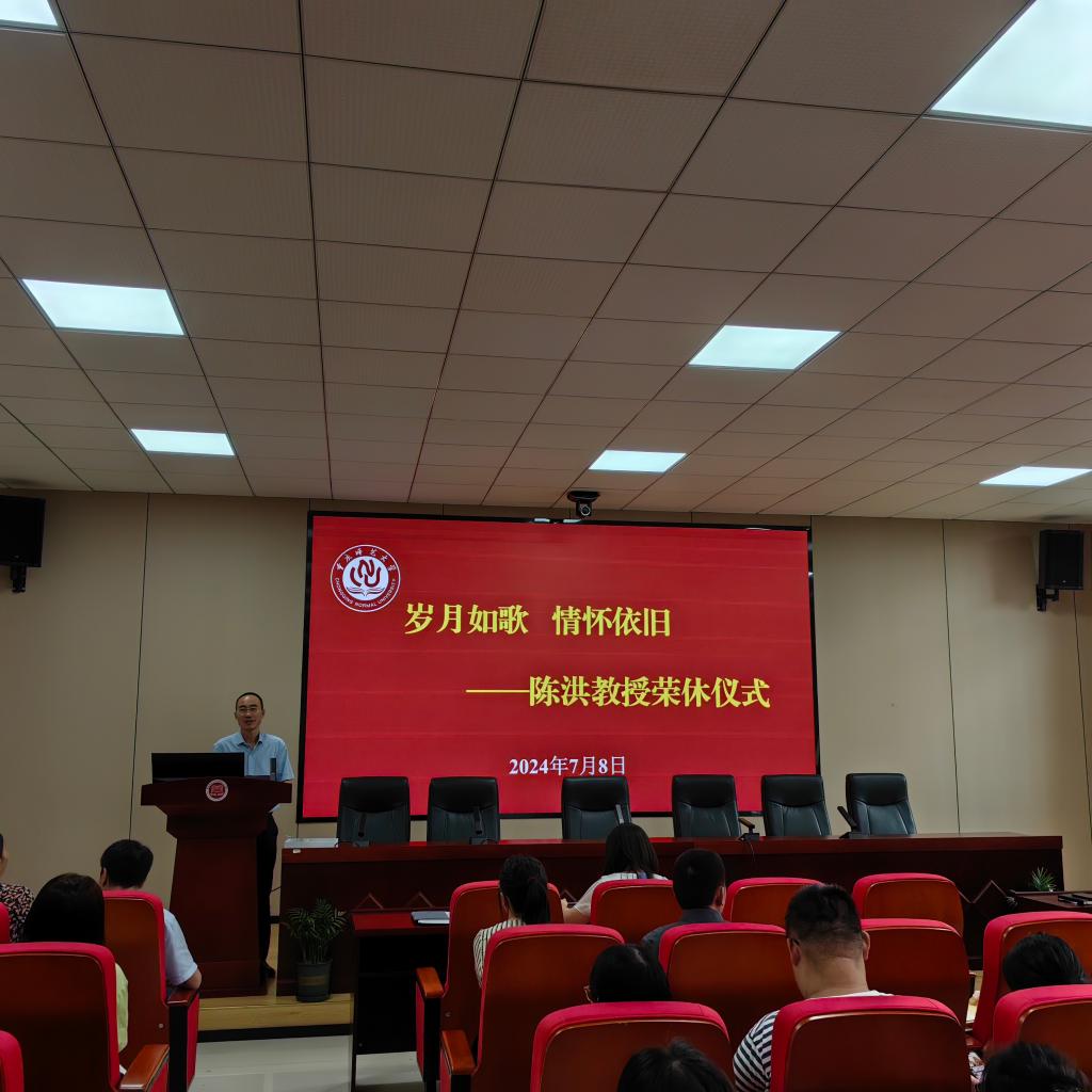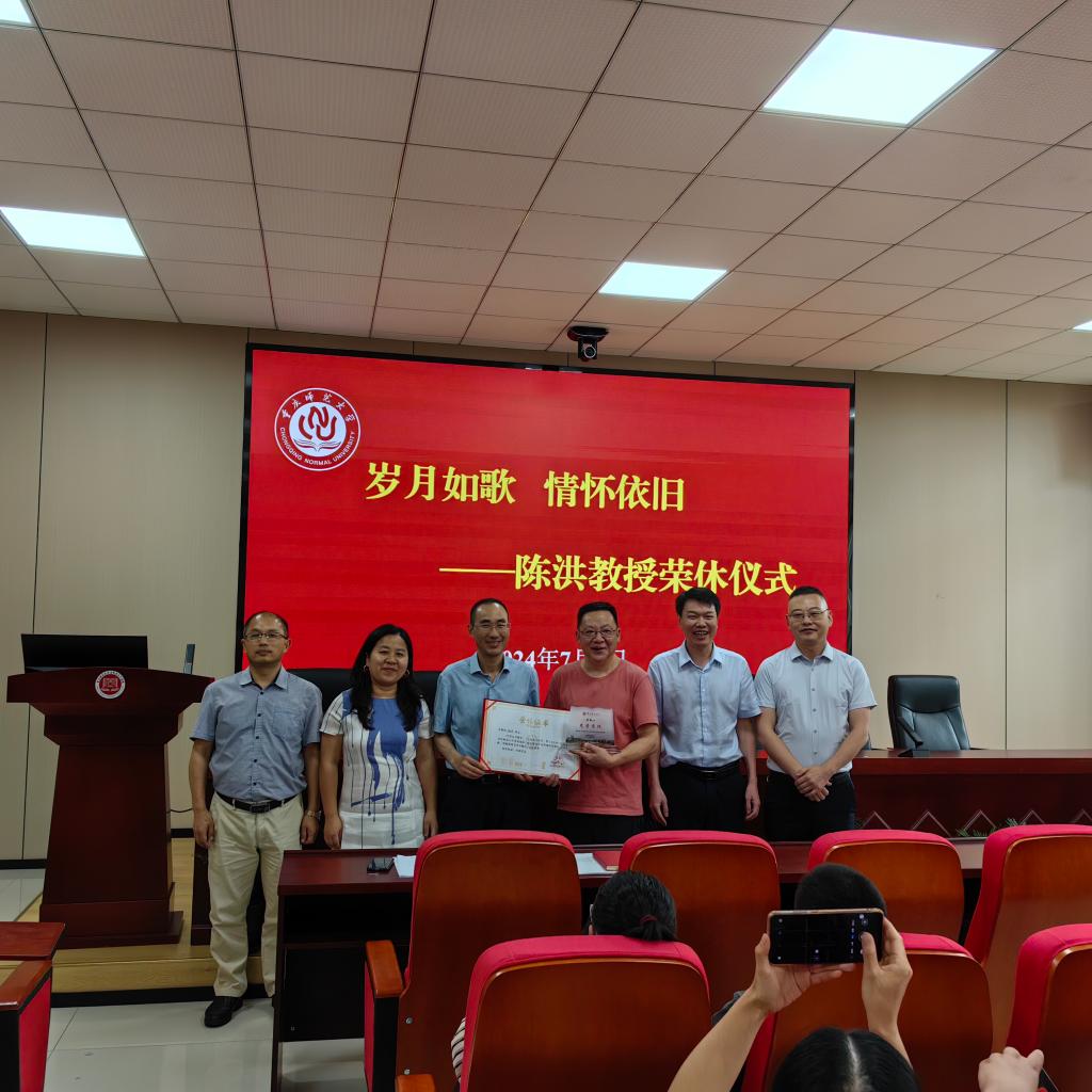 为彰显学校人文关怀,展现学院对退休教师职业生涯所作贡献的充分肯定和感激,2024年7月8日上午,我院在106会议室为即将退休的陈洪教授举行了以“岁月如歌,情怀依旧”为主题的荣休仪式。荣休仪式由执行院长姜土生主持,全院教职工参加。