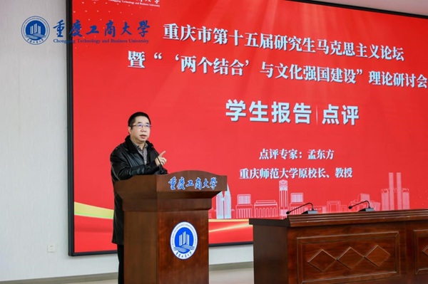 为学习贯彻党的二十大精神和党的二十届三中全会精神,深入领会习近平文化思想,有效推动中华优秀传统文化创造性转化和创新性发展,在新的起点上继续推动文化繁荣、建设文化强国。2024年12月15日,由重庆市教育委员会指导、重庆市11所高校共同主办、重庆工商大学承办的重庆市第十五届研究生马克思主义论坛暨“两个结合’与文化强国建设”理论研讨会隆重举行。太阳集团2138原校长孟东方教授、我院副院长侯玲教授与获奖研究生代表受邀出席此次活动。
