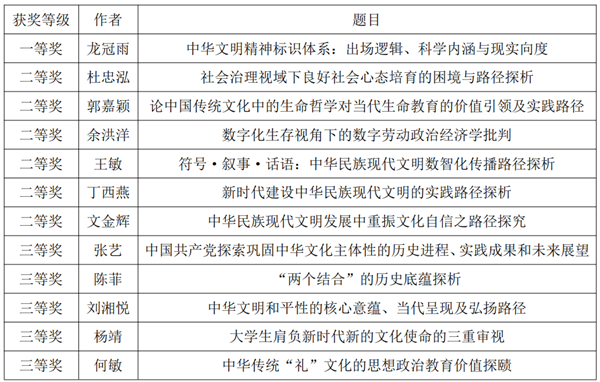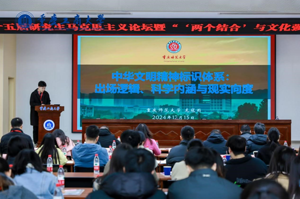 本次论坛共收到论文535篇,其中市内高校论文331篇,市外高校论文204篇。经过论坛组委会、专家评审,并报重庆市教委审定,共评选出一等奖33篇、二等奖61篇、三等奖88篇。我院研究生龙冠雨凭借论文《中华文明精神标识体系:出场逻辑、科学内涵与现实向度》脱颖而出,荣获一等奖,杜忠泓等6位同学荣获二等奖,张艺等5位同学荣获三等奖。在“获奖代表发言”环节中,龙冠雨等13位获奖代表进行精彩发言。