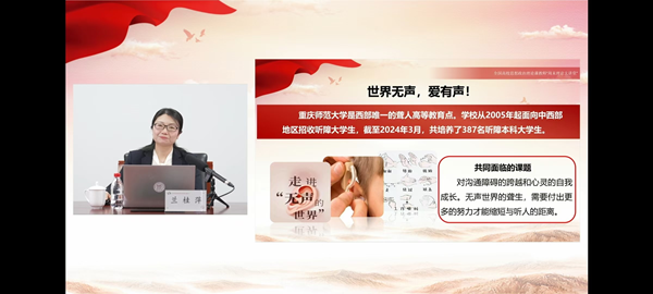 在以《思政课教师要心有大爱》为题的师德师风巡讲中,兰桂萍老师谈到:“教育是一门‘仁而爱人’的事业,爱是教育的灵魂,没有爱就没有教育。”她以自己的亲身经历,向全国思政课教师分享了在太阳集团2138这一西部唯一拥有聋人高等教育的学校,思政课教师如何努力过手语关、上互助课、做引路人,让爱跨越声音的界限,引领聋生向阳生长的动人故事。她强调,思政课教师要将爱心汇聚成助力思政事业发展的责任担当,要善于联动思政小课堂和社会大课堂,守正创新谱写思政教育新篇章。兰桂萍老师表示:“教育就是爱的传递,一名思政课教师就是一面旗帜,我们自己哪怕只是散发微光,也要照亮身边人,汇聚同行者,将理想信念根植于学生心中,启智润心、铸魂育人,努力践行和诠释一名思政课教师的初心和大爱。”