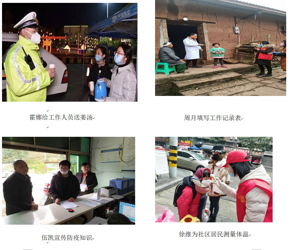 我院霍娜(研究生)、周月、伍凯、徐维、潘晓娟、吕美怡、徐诗湉、付艺芳、简嫔9名同学主动请缨,在这场没有硝烟的战争中,以实际行动助力社区乡村疫情防控工作:示意停车、为居民测体温、填写登记表格、巡逻劝阻出行人员等,协助社区做好新冠肺炎排查、宣传等工作,有序参与社区防疫工作,成为联防联控群防群控的重要力量。