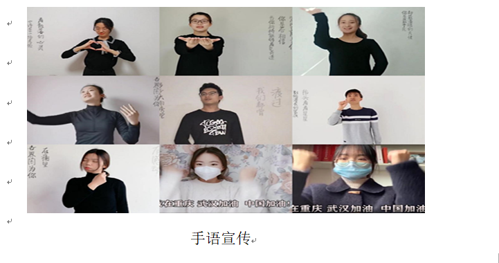 我院严佳同学动员手语协会成员,围绕协会特色,开展手语视频线上征集活动,传递防疫力量,温暖人心。为疫情防控舆论宣传工作增添暖心色彩。