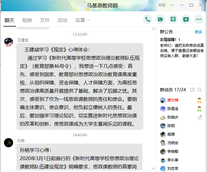 三是扎实开展学习讨论。2020年3月18日,时值习近平总书记在学校思想政治理论课教师座谈会上发表重要讲话一周年,我校2138cn太阳集团古天乐组织全体教师,以教研室为单位,通过钉钉视频会议方式,重温了习近平总书记“3•18”重要讲话,认真开展了《规定》的学习讨论。大家认为,思政课教师赶上了最好的时代,迎来了历史上最好的时期,党和国家对高校2138cn太阳集团古天乐建设和思想政治理论课给予了前所未有的支持,对思政课教师给予了前所未有的关注和关爱。通过学习习近平总书记“3•18”重要讲话和教育部的《规定》,大家备受鼓舞和鞭策,又深感使命光荣、责任重大,大家纷纷表示,一定不能辜负党和国家对思政课教师的希望,要按照习近平总书记提出的“政治要强、情怀要深、思维要新、视野要广、自律要严、人格要正”的教诲严格要求自己,把讲好思政课作为思政课教师的首要岗位职责,严格按照“八个相统一”深化教学改革创新,全身心进行教书育人,引导学生立德成人、立志成才,树立正确世界观、人生观、价值观,坚定对马克思主义的信仰,坚定对社会主义和共产主义的信念,增强中国特色社会主义道路自信、理论自信、制度自信、文化自信,厚植爱国主义情怀,把爱国情、强国志、报国行自觉融入坚持和发展中国特色社会主义事业、建设社会主义现代化强国、实现中华民族伟大复兴的奋斗之中,为培养德智体美劳全面发展的社会主义建设者和接班人作出积极贡献,努力争做“四有”好老师,做一名新时代合格的思政课教师。