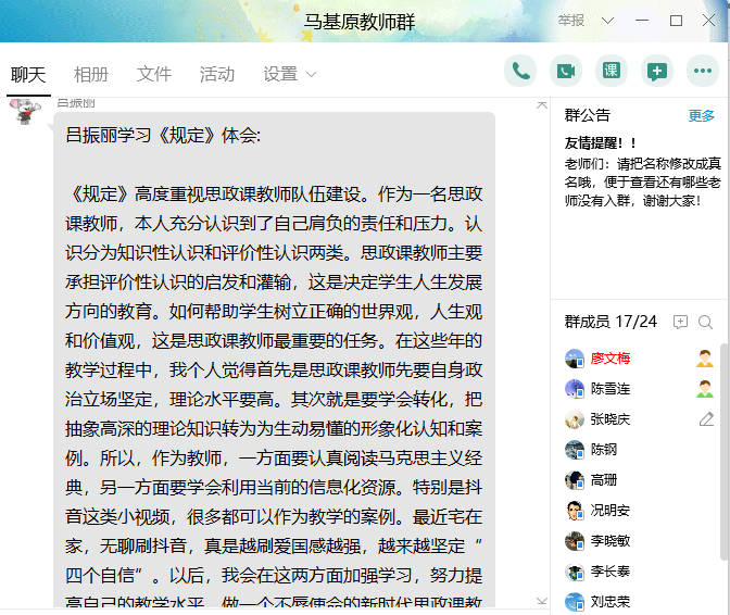 学习讨论结束后,各教研室还开展了集体备课。针对疫情期间线上教学情况,大家就线上课程教学中的做法、心得、亮点,目前的教学进度、专题教学中的重难点,以及线上教学中存在的困难和问题进行了深入交流,分享了开展经典文献阅读、深化课堂学习、布置平时作业、拓展学习内容等经验做法。