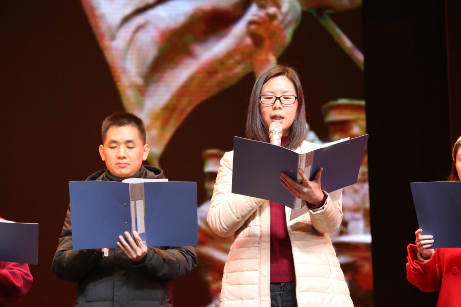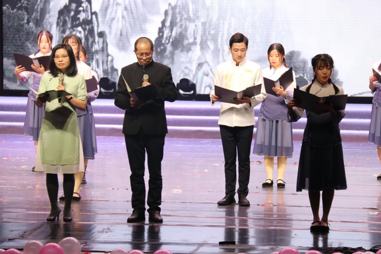 除学生表演外,老师也展现出不同于课堂上的一面。朗读《国学诵读》中,李长泰老师、魏冰娥老师与学生一起,站上舞台,以小我之姿,传诵经典,弘扬中华传统文化;中特全体老师朗读《旗帜》,气势磅礴浑厚,更是表达了马院全体师生对祖国的颗颗赤诚之心。