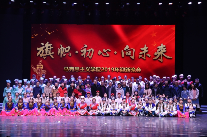 晚上九时,晚会在歌曲悠扬的合唱《我和我的祖国》中落下帷幕,全体参演人员同全体老师合影留念。本次晚会不仅为全院师生搭建了一个展示自我的平台,拉近师生之间的距离,增强了师生情谊;同时也是马院师生对“文化自信、理论自信、道路自信、制度自信”内涵理解的生动展示。此次以“旗帜•初心•向未来”为主题的晚会彰显了马院在2020年这新的一年中将始终牢记“不忘初心、牢记使命”的时代要求,继续高举中国特色社会主义伟大旗帜,坚持团结全体师生以永不懈怠的精神状态和一往无前的奋斗姿态奋勇向前的决心。