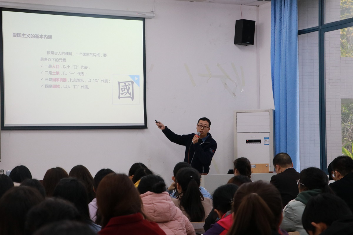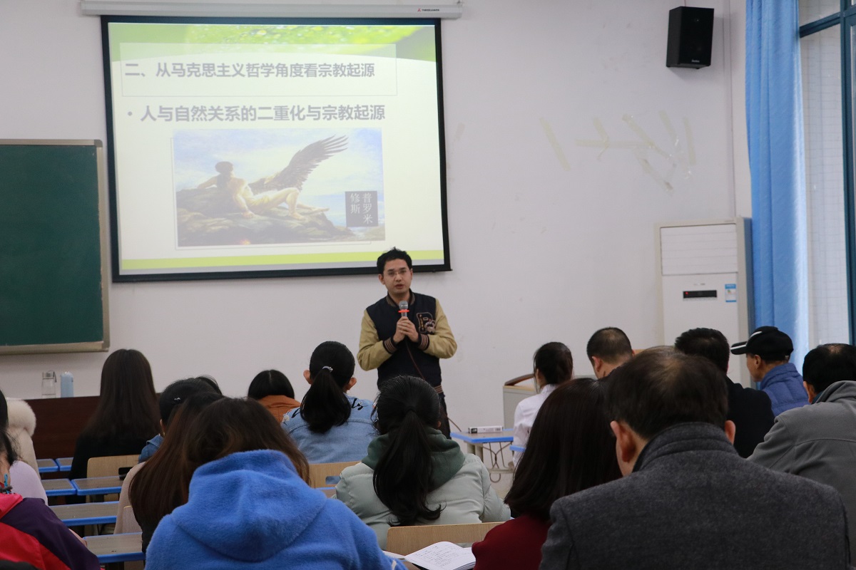 接着,吴烁偲、周凡和刘龙三位教师分别进行新进教师公开课展示。吴烁偲老师借助短视频导入课程,引出宗教的背景与内容。通过发掘早期人与自然的关系,引出人对自然界的崇拜与敬畏,指明宗教的产生路径。他从两个维度阐释了宗教发展的阶段,指出宗教发展既可划分为自然宗教、多神教、一神教三个阶段,也可划分为氏族宗教、民族宗教、超民族跨语言宗教三个阶段。周凡老师以《武装斗争:中国革命的优点和特点》为题进行授课,他指出当今时代的主题是和平与发展,引出20世纪前50年代战争与革命的时代主题。回顾历史,放眼世界,他结合俄国、印度革命,具体分析中国革命的特点及优点,剖析了武装斗争的必然性。他总结无论是革命年代还是和平年代,人民军队始终是人民的坚强后盾、是中国特色社会主义制度的重要支撑。刘龙老师讲授的课程题目是《爱国主义的基本内涵》,他形象地讲解了国家的“国”字,点明了国家的基本内涵:国土、国民、政府及文化。他依据翔实的资料,紧紧围绕“爱祖国的大好河山”“爱自己的骨肉同胞”“爱祖国灿烂的文化”“爱自己的国家”四个部分论述了爱国主义的基本内涵,强化了在场师生的爱国主义情感。
