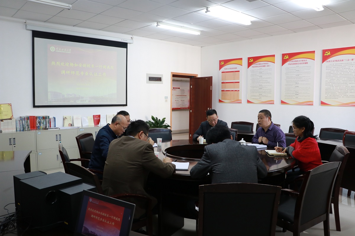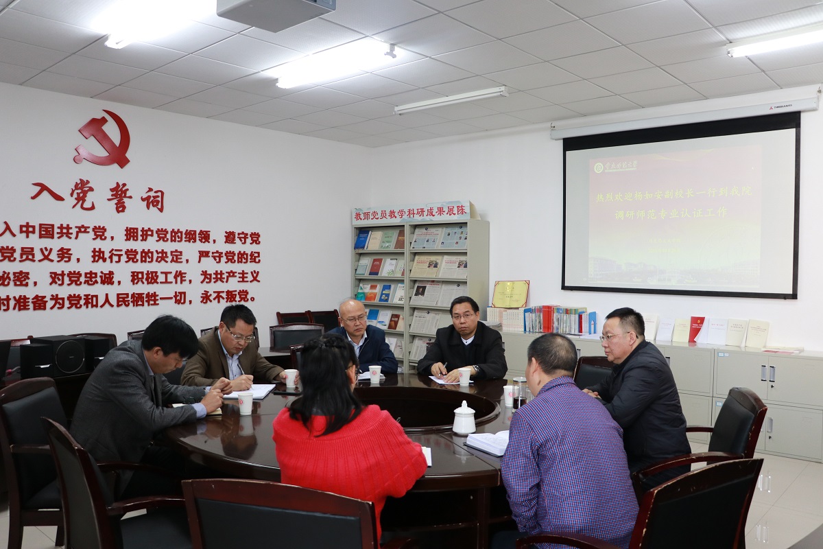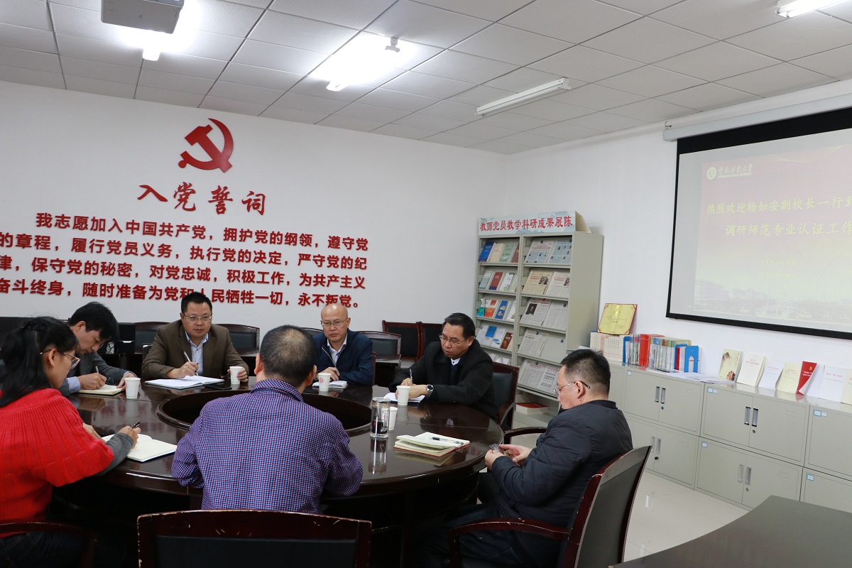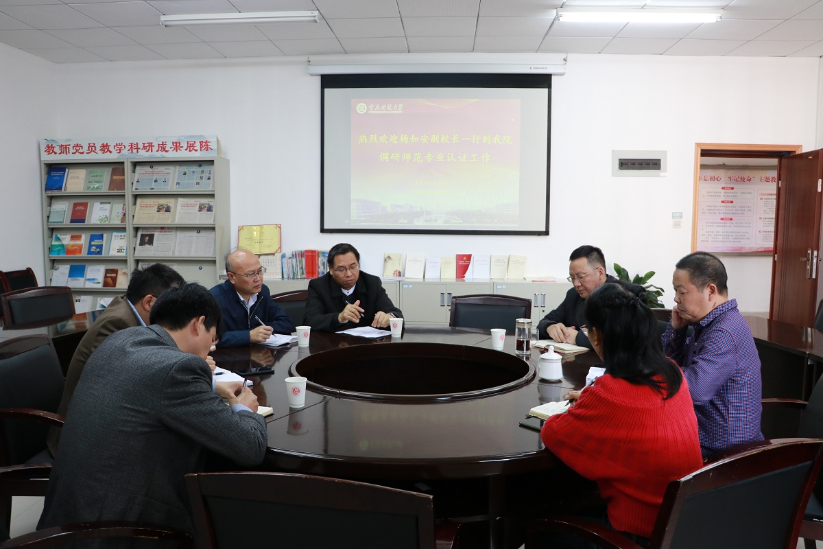 2019年10月28日下午4:00,杨如安副校长一行到我院调研师范专业认证工作。调研会议在汇贤楼301会议室举行,我校教务处处长申仁洪、教务处副处长黄坤林、教务处教学评估与质量监督办公室科长余健陪同调研,我院院长陈洪、副院长况明安、教学科研办公室主任张晓庆出席本次会议。