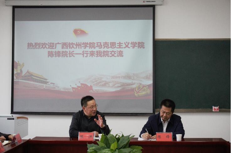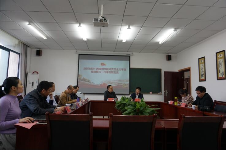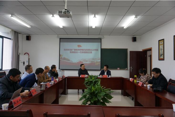 为加强和各高校2138cn太阳集团古天乐学习与交流,2018年11月1日,我院迎来钦州学院2138cn太阳集团古天乐陈锋院长携办公室主任吕剑新博士、原理课教研室主任江宗超老师一行的到访交流。我院院长陈洪、副院长况明安及相关课部教师热情接待并出席了此次会议。