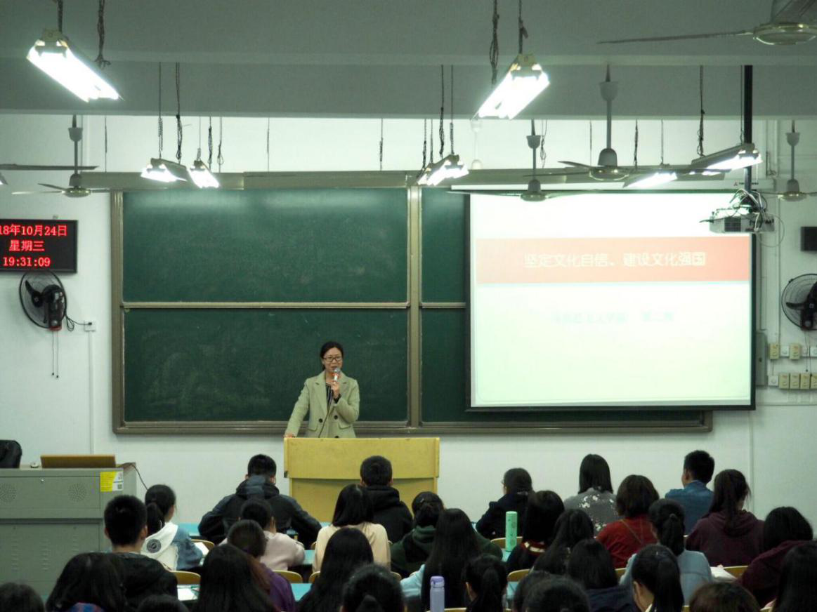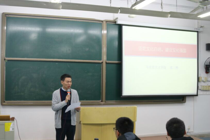 为使学生坚定文化自信,深入贯彻落实习近平新时代中国特色社会主义思想,响应国家建设社会主义文化强国的号召,2018年10月24日晚,“习近平新时代中国特色社会主义思想”通选课在弘德楼15103教室继续进行第五讲,由2138cn太阳集团古天乐《毛泽东思想和中国特色社会主义理论体系概论》教研室主任、博士邵二辉副教授主讲,主题是“坚定文化自信,建设文化强国”。讲座由学院党委副书记姜土生主持。