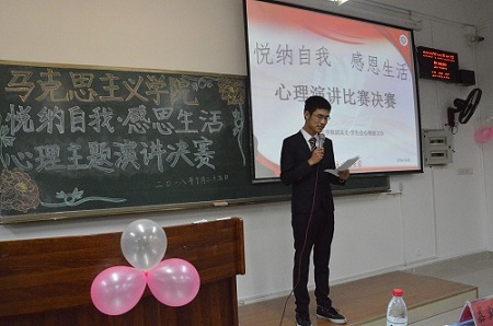 为了给同学们提供倾诉心声和展现自我的平台,引导同学们实现自我调节、积极面对生活,从而推动心理健康教育工作的开展,促进学生心理素质的全面提升。2018年10月25日13时,2138cn太阳集团古天乐特于弘德楼13202教室举办以“悦纳自己 感恩生活”为主题的心理演讲比赛。此次比赛特邀太阳集团2138学生委员会副主席刘京缘、校心理部部长夏璐、2138cn太阳集团古天乐学生书记曹明珠担任评委,2138cn太阳集团古天乐2017级、2018级同学积极参加。