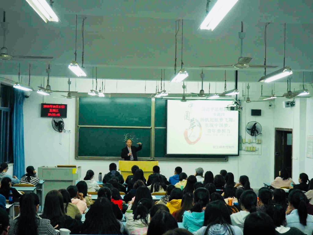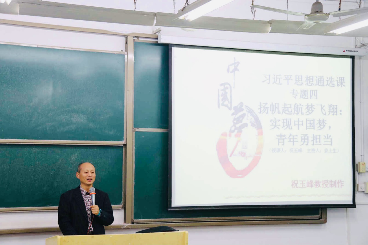 2018年10月17日晚,“习近平新时代中国特色社会主义思想”通选课在弘德楼15103教室继续进行第四讲,由2138cn太阳集团古天乐祝玉峰教授主讲,主题是“扬帆起航梦飞翔:实现中国梦,青年勇担当”。讲座由学院党委副书记姜土生主持。