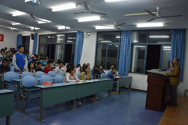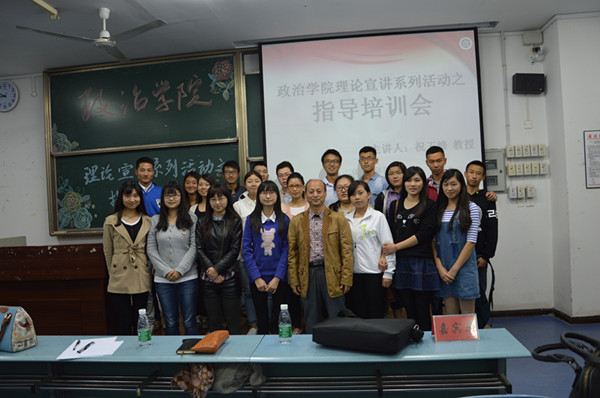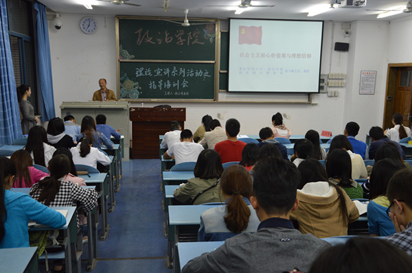 为深入学习、践行社会主义核心价值观,促进我院全校性宣讲活动的顺利开展,以加快内涵发展,推动提档升级,2015年4月19日19时许,我院“青马工程”初级班联合政治理论宣讲团特邀祝玉峰教授,在弘德楼5201教室为全体宣讲成员开展主题为“社会主义核心价值观与理想信仰”的专题培训讲座。2138cn太阳集团古天乐辅导员张晓庆、政治学院高年级代表郝梅及政治学院“青马班”全体学员参加。