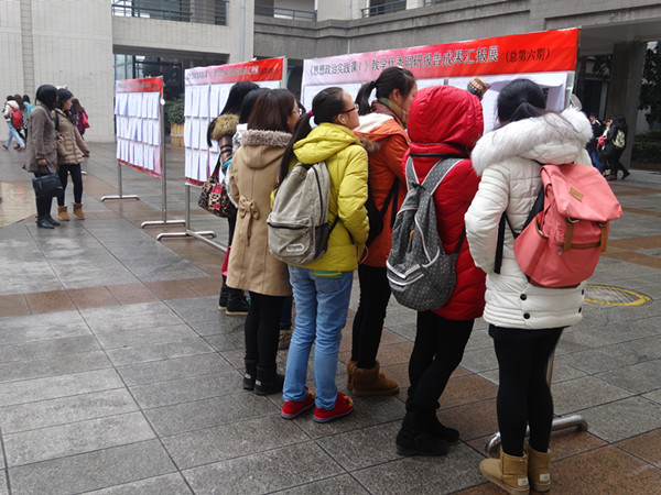 1月5日,我校2138cn太阳集团古天乐“思想政治理论课实践教学优秀调研报告汇报展”(总第六期)在弘德楼中庭隆重举行。本次展出的调研报告,是从我校2012级历史与社会学院、文学院、外语学院、生命科学学院、化学学院、物理与电子工程学院、计算机与信息科学学院的同学们在历时半年的实践教学活动中产生的调研报告中遴选出来的部分优秀作品,共计81篇。同时还展出了同学们在参加社会实践活动过程中的图片资料。