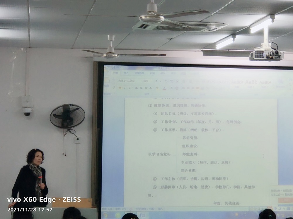 学生干部是学校学生中的骨干,是学校联系学生的纽带。为了帮助同学们更加深入地了解学生干部的工作,同时明确学生干部的应尽职责,提高学生干部的整体素质,更好地发挥“纽带”的作用,加强学生队伍的凝聚力,战斗力,2021年11月28日17时,我院于励志楼12410教室为2021级新生做以“学生干部能力素质与服务意识培训”为主题的指导讲座。本次讲座由学院团委书记,2021级辅导员马小又老师担任主讲人。2021级全体同学认真聆听,虚心学习。