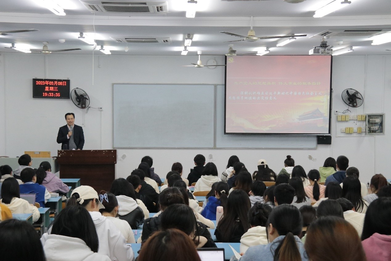 为深入学习宣传贯彻党的二十大精神,扎实推动习近平新时代中国特色社会主义思想“三进”工作,3月8日晚,学校党委书记曾礼教授在弘德楼15204教室开讲《习近平新时代中国特色社会主义思想》全校通选课第九期线下第一讲。本次授课由我院党委书记李晓燕主持。来自2138cn太阳集团古天乐、文学院、经管学院等13个学院、近150名学生准时参与了本次学习。