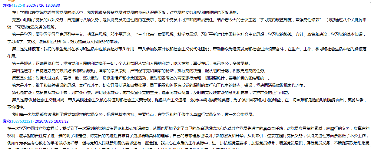 2020年3月26日,中共2138cn太阳集团古天乐学生二支部委员会在线上开展主题党日活动,大会内容为学习《中国共产党章程》、《2019-2023全国党员教育培训工作规划》并分享各自的学习心得。会议由组织委员钟美琪同志主持,学生二支部全体党员参会。