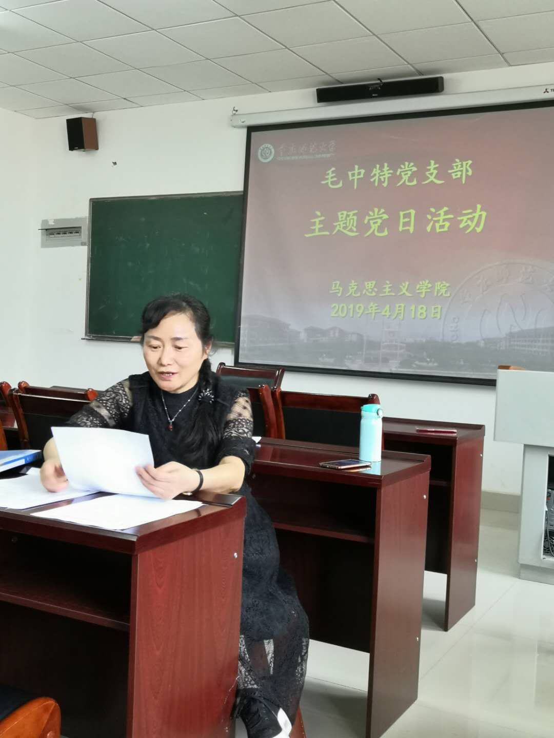 2019419日下午,毛中特党支部全体成员在学院楼201开展主题党日活动,学习了习近平总书记在学校思想政治理论课教师座谈会上的重要讲话,并讨论交流了新时代如何当好一名思政课老师。