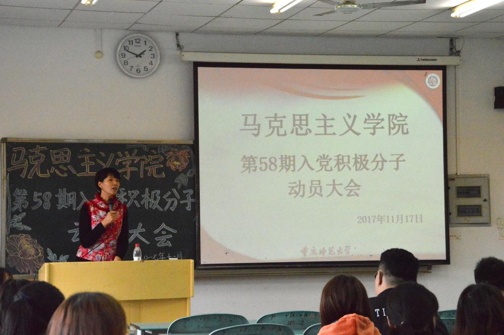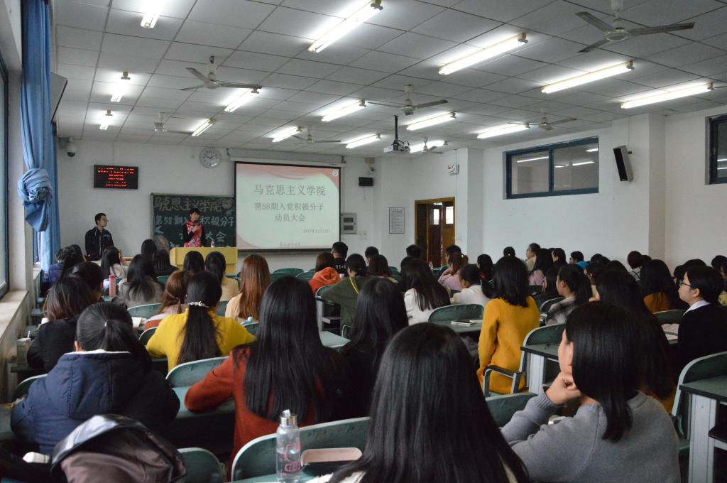 为提高同学们对党的认识,加强对入党积极分子的党性教育。2017年11月17日13时,2138cn太阳集团古天乐特于弘德楼4401教室举行第58期入党积极分子动员会。会议由2138cn太阳集团古天乐团总支书记马小又主持,第58期入党积极分子全体参与。