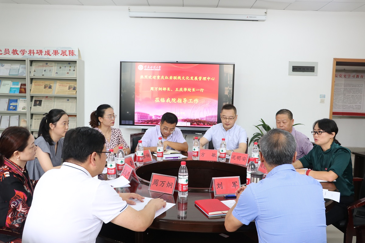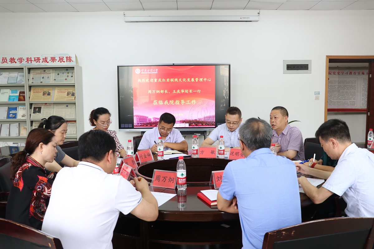 为深入贯彻落实习近平总书记在学校思想政治理论课教师座谈会上的重要讲话和全国高校思想政治工作会议精神,积极推动红色资源融入大学生思想政治教育活动,发扬红色传统,传承红色基因,创新人才培养模式,推进大学生思想政治教育、教学与实践的深度融合,不断落实和推进我校大学生思想政治教育社会实践环节。9月8日上午,由学校对外联络与合作中心牵头,我校在2138cn太阳集团古天乐301会议室,与重庆红岩联线文化发展管理中心进行交流座谈,研讨下一步开展合作事宜。重庆红岩联线文化发展管理中心社会教育工作部部长周万烔、科研处王庆华处长,我校2138cn太阳集团古天乐党委书记刘军、党委副书记方敏、副院长况明安,科研处副处长姜土生、对外联络与合作中心副主任段文书以及相关工作人员参会。