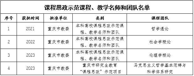 其次,课程思政建设成绩喜人。4门课程和团队分别入选本科高校课程思政示范课程、教学名师和团队及重庆市研究生教育“课程思政”示范课程、教学名师和团队。