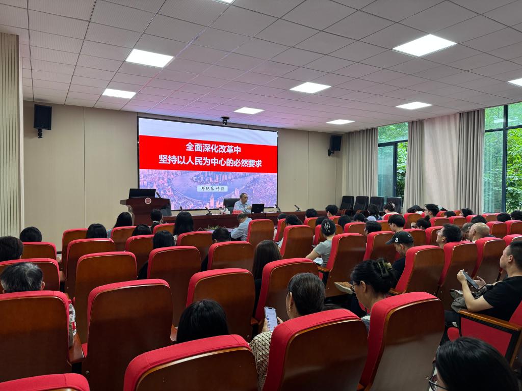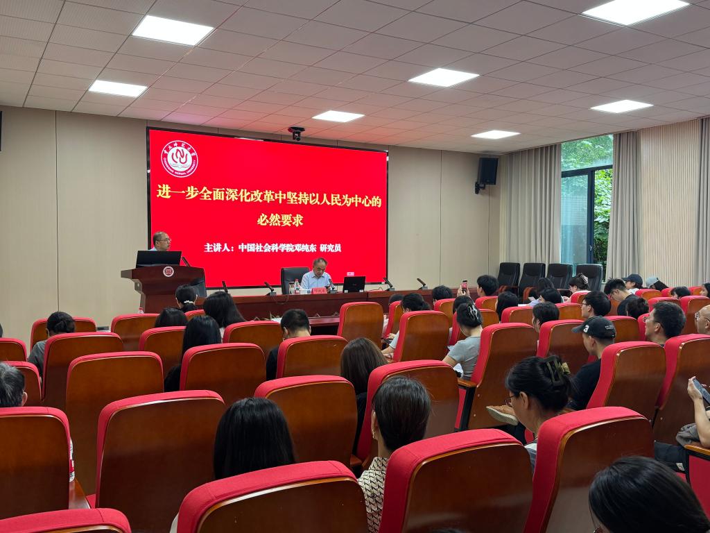 为深入学习贯彻党的创新理论,持续强化师生党员党性修养,提升政治自觉与政治担当,6月30日,我院特邀中国社会科学院邓纯东研究员在学院106会议室作题为《进一步全面深化改革中坚持以人民为中心的必然要求》的党员学习教育专题讲座。讲座由副院长田方林教授主持,全院教职工及学生党员代表到场聆听学习。