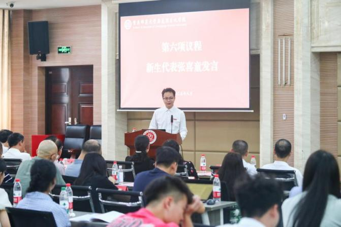 新生代表张喜童同学代表全体研究生新生致谢并表态在未来三年努力做到四点:主动沟通,明晰方向;沉潜书海,理论筑基;实践淬炼,知行合一;多维赋能,笃行致远。他表示全体新生将在导师们的引领指引下,书写青春新篇章。